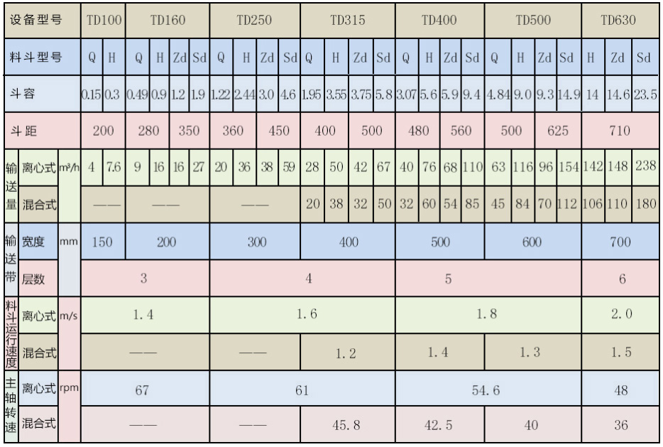 (1) 輸送量大,相同斗寬的TD型與D型相比,輸送量增大近一倍。